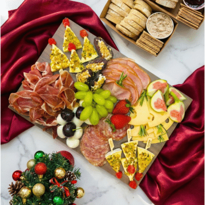Presunto cru, burrata, espetinhos de cerejinha de búfala com tomatinhos...