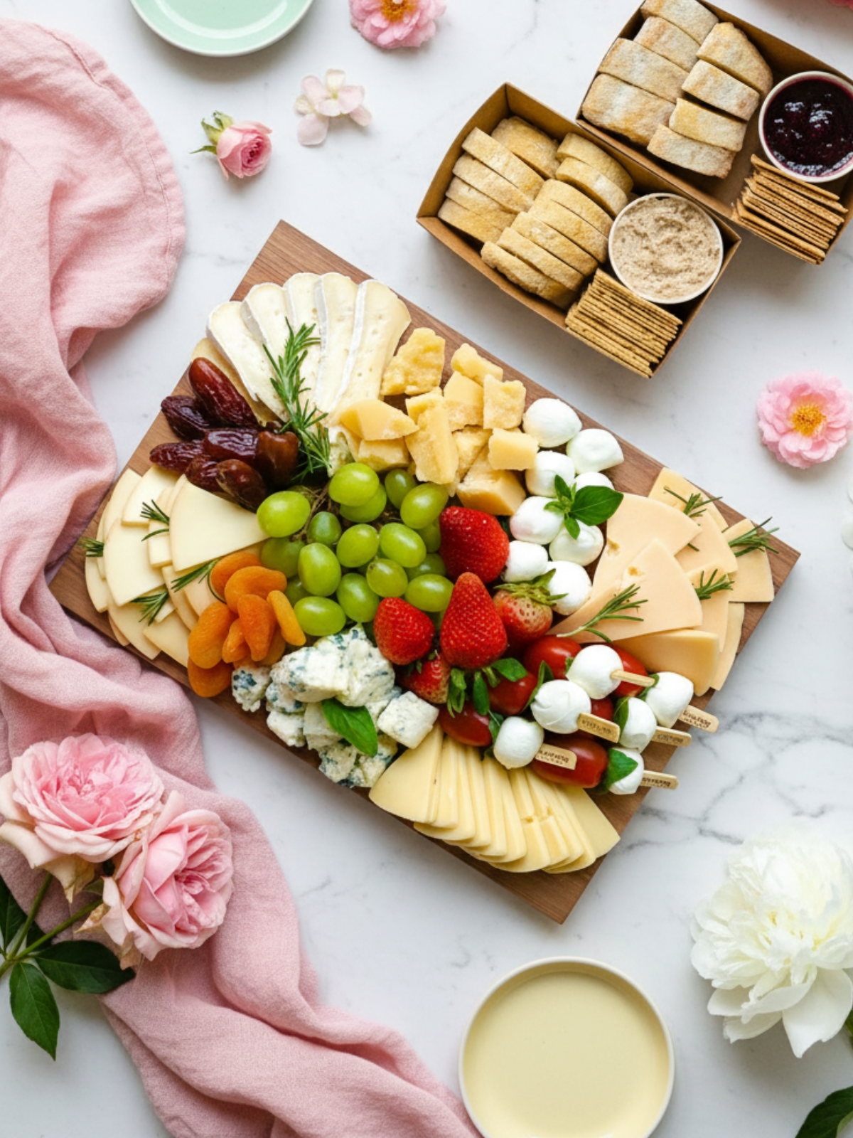 Brie, gouda, cerejinha de búfala, gorgonzola, minas padrão, provolone, parmesão, espetinho caprese (6un), cracker de gergelim e linhaça e ciabatta, patê de azeitonas pretas e geleia de frutas vermelhas, damasco turco seco, tâmara fresca jumbo, uva e morango.