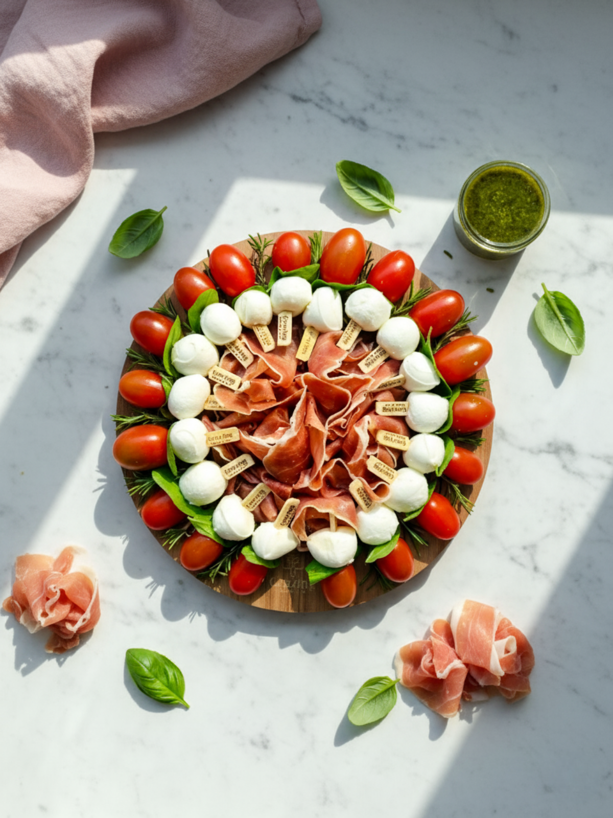 Presunto cru, espetinhos de cerejinha de búfala com tomatinhos e manjericão, molho pesto.