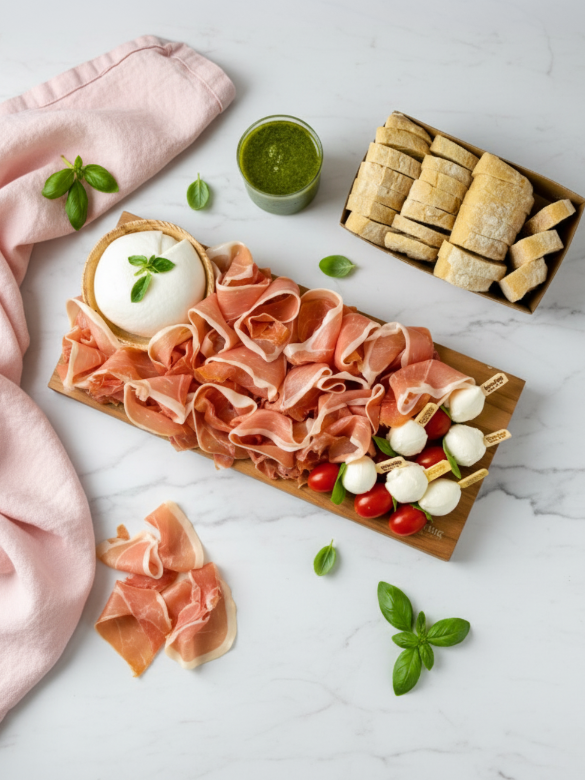 Presunto cru, burrata, espetinhos de cerejinha de búfala com tomatinhos e manjericão, molho pesto e ciabatta.