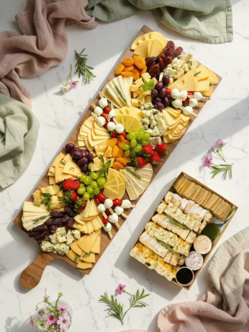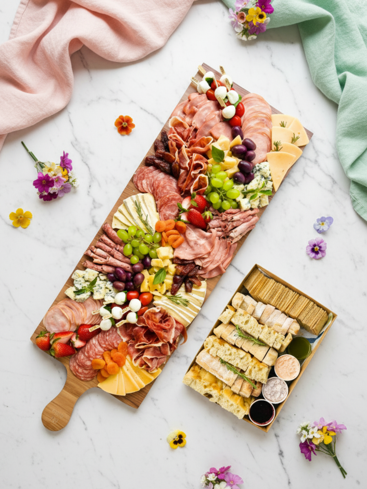 Receita: Presunto cru, salame, lombo canadense, pastrami, mortadela bologna, brie, gouda, espetinho caprese, gorgonzola, parmesão, cracker de gergelim e linhaça, cracker de parmesão, ciabatta, focaccia, patê de azeitonas pretas, geleia frutas vermelhas, patê de tomate seco e pesto, damasco turco seco, tâmaras frescas jumbo, azeitonas pretas, uva e morango.